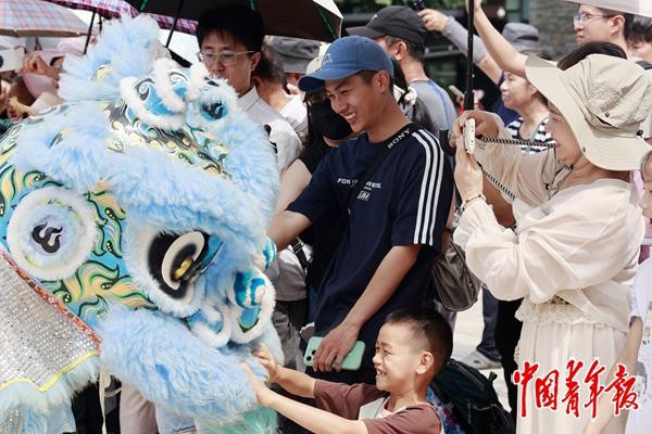 10月1日,广西南宁园博园,游客围观醒狮表演。10月1日-8日,南宁园博园举办“非遗聚园博南宁烟花秀”国庆、中秋活动,给市民带来丰富多彩的节日体验。中青报·中青网记者谢洋/摄