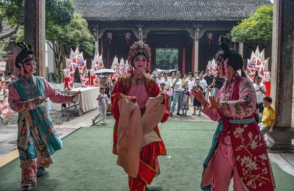 10月1日,在浙江省金华市非遗馆,游客观看浙江婺剧艺术研究院演员表演婺剧《梳妆》。今年国庆与中秋“双节”叠加,各地丰富文旅供给,促进假日文化和旅游消费。人们出游热情高涨,各大旅游景区人潮如织。时宽兵/...