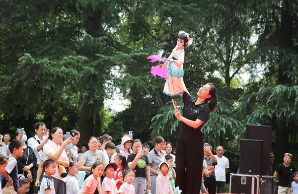 10月2日,游人在江苏省南通市如皋市水绘园景区观看非遗木偶戏表演。“双节”期间,如皋市举办丰富多彩的特色非遗进景区活动。徐慧/视觉中国